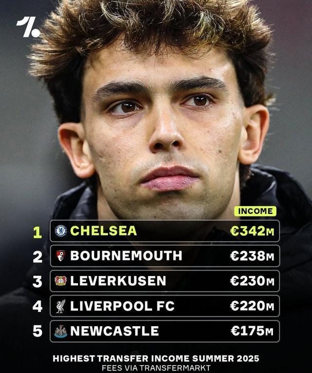 切尔西成为今夏转会收入最高的俱乐部,也是成为第一家球员出售收入超过3亿英镑的英超俱乐部!