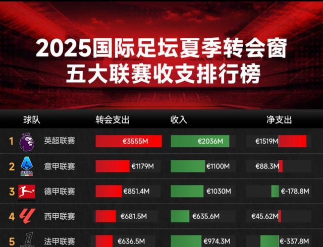 意甲支出11.8亿欧元、德甲8.6亿欧元、西甲6.8亿欧元、法甲6.3亿欧元。